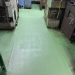 工場が休業日の施工であったため、斫り作業に関しても特に支障はありませんでした。施工の初期段階では、斫り作業の実施とともに新設土間へ樹脂モルタルを塗布し、その後1週間のモルタル乾燥養生期間を設けました。モルタル面の乾燥状態も良好であり、その後の塗床施工においても特に問題なく行えました。