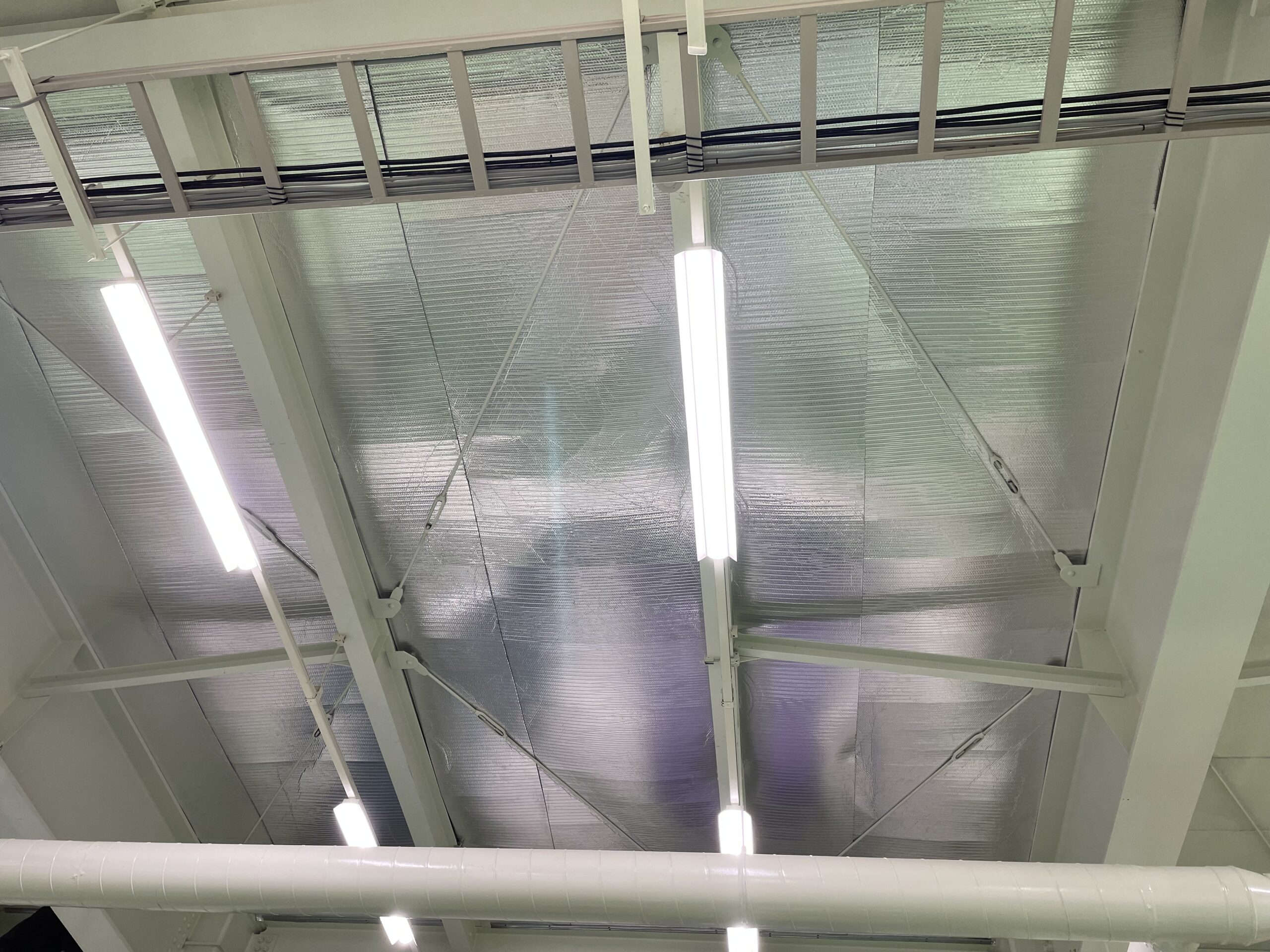 夏場の暑熱対策のため、工場の屋根裏に遮熱シート施工を行いました。